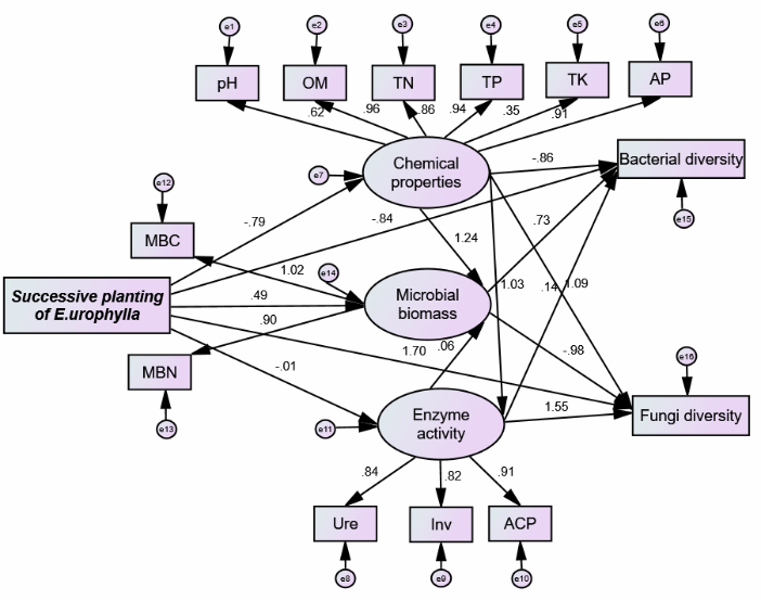 本系列研究首次采用结构方程模型调查连续种植桉对土壤特性和微生物群落的直接和间接影响,发现桉树人工林的连续种植显著降低了土壤化学性质,酶活性以及微生物生物量碳和氮,进而显著改变了细菌和真菌的群落组成连栽模式对人工林土壤细菌和真菌群落结构多样性,微生物生物量和酶活性的影响主要通过土壤环境因子驱动。为了实现桉树人工林的可持续经营管理,应将土壤微生物群落多样性作为土壤健康评价指标。